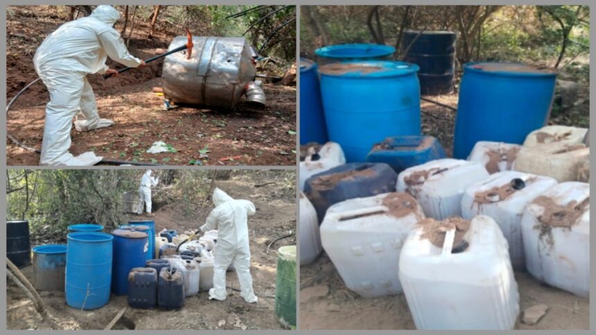 En el lugar también se detectó un área de almacenamiento con aproximadamente 3 mil 600 litros de sustancias químicas, además de 200 kilogramos de hidróxido de sodio, bidones, tanques de gas y tambos de plástico.
